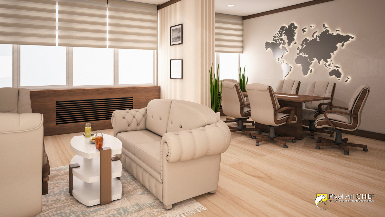 Aydın SGK İl müdürlüğü makam odası ve toplantı odası ile ilgili tasarımımız. Toplantı odasında masa etrafına 24 Katılımcı ve 1 Makam olarak geniş ve uzun bir toplantı masası bulunmaktadır. Genel olarak Krem rengi hakimiyetindeki yapımızda bir adet Videowall bulunmaktadır.
