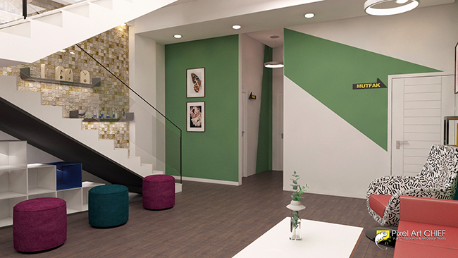 Genel yapıda bulunan oda bölmeleri ve dekorasyon işlerinin hepsi yapılmış ve tefrişatta kullanılan mobilyalar üretime hazır halde sunulmuştur.