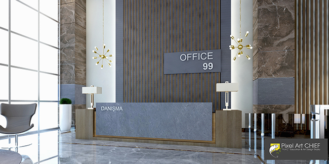 Projemizde Ofis 99 Plaza binasının girişini yani hol kısmını tasarladık. Bu bölümde duvarlarda ahşap mermer desenli panaller kullandık. Tavanda 7 adet alüminyum daire halka avize kullandık. Yerleri komple mermer ile tamamladık. Genel yapı yüksek tavana uygun olduğu için geniş bir alan elde etmş olduk.