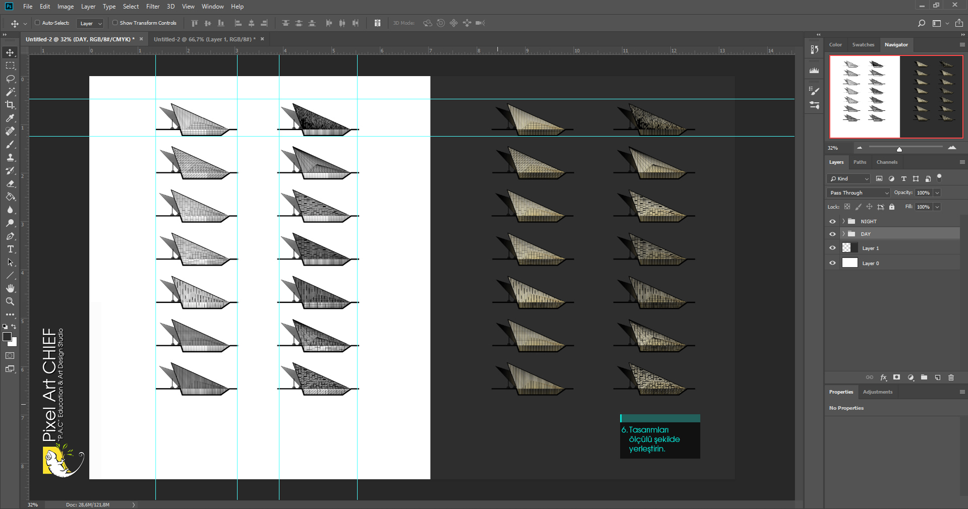 Güneş Üçgeni projemiz için cam cephenin nasıl ifade edileceğine dair bir dizi farklı fikirler test ediyoruz. Bu çalışmalardan, üretilen iterasyonların bazılarını gösteren bir yayılım geliştirdik. Bu illüstrasyonu bir araya getirirken, genellikle diyagram dosyalarımızı nasıl düzenlediğimizi ayırmanın yararlı olabileceğini düşündük. Sayfa içerisinde işlem yapıp kompozisyonu anlamaya çalışırken boyutu, keskinliği ve düzenleme yeteneğini kontrol etmek için çok sayıda akıllı nesne kullanıyoruz. Aşağıda bulunan iş akışından anlayacağınız gibi pafta için güzel bir tasarım olacaktır. Eğitimin en altında iş akışını gösteren videomuz mevcuttur.